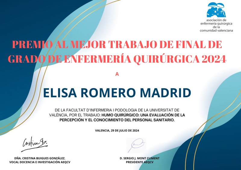En el curso académico 2023-2024, la Asociación de Enfermería Quirúrgica de la Comunidad Valenciana (AEQCV) ha otorgado el premio al mejor Trabajo de Fin de Grado (TFG) a Elisa Romero Madrid, estudiante de 4º curso del Grado en Enfermería en la Universitat de València. El trabajo, titulado «Humo quirúrgico: una evaluación de la percepción y el conocimiento del personal sanitario», se ha destacado por su relevancia y rigor científico, abordando un tema crucial para la seguridad en los entornos quirúrgicos.